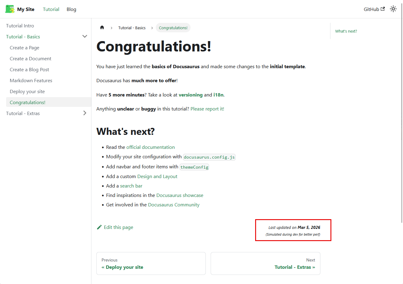 | Last-updated date | Frontmatter last_update; renders at top of page | Requires showLastUpdateTime: true; renders at bottom |