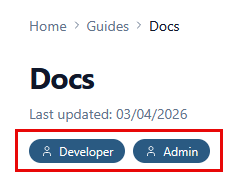 Audience roles built into the content model. The role array in frontmatter renders colored chips below the page title, so readers immediately know whether a page is relevant to them.