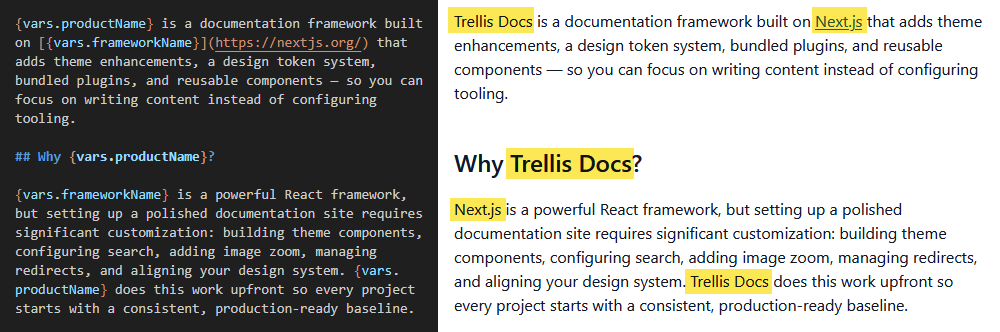 Variables and partials built in. Define a product name once in config/variables.ts and reference it anywhere with {vars.productName}. Pair that with @include directives for shared content partials.