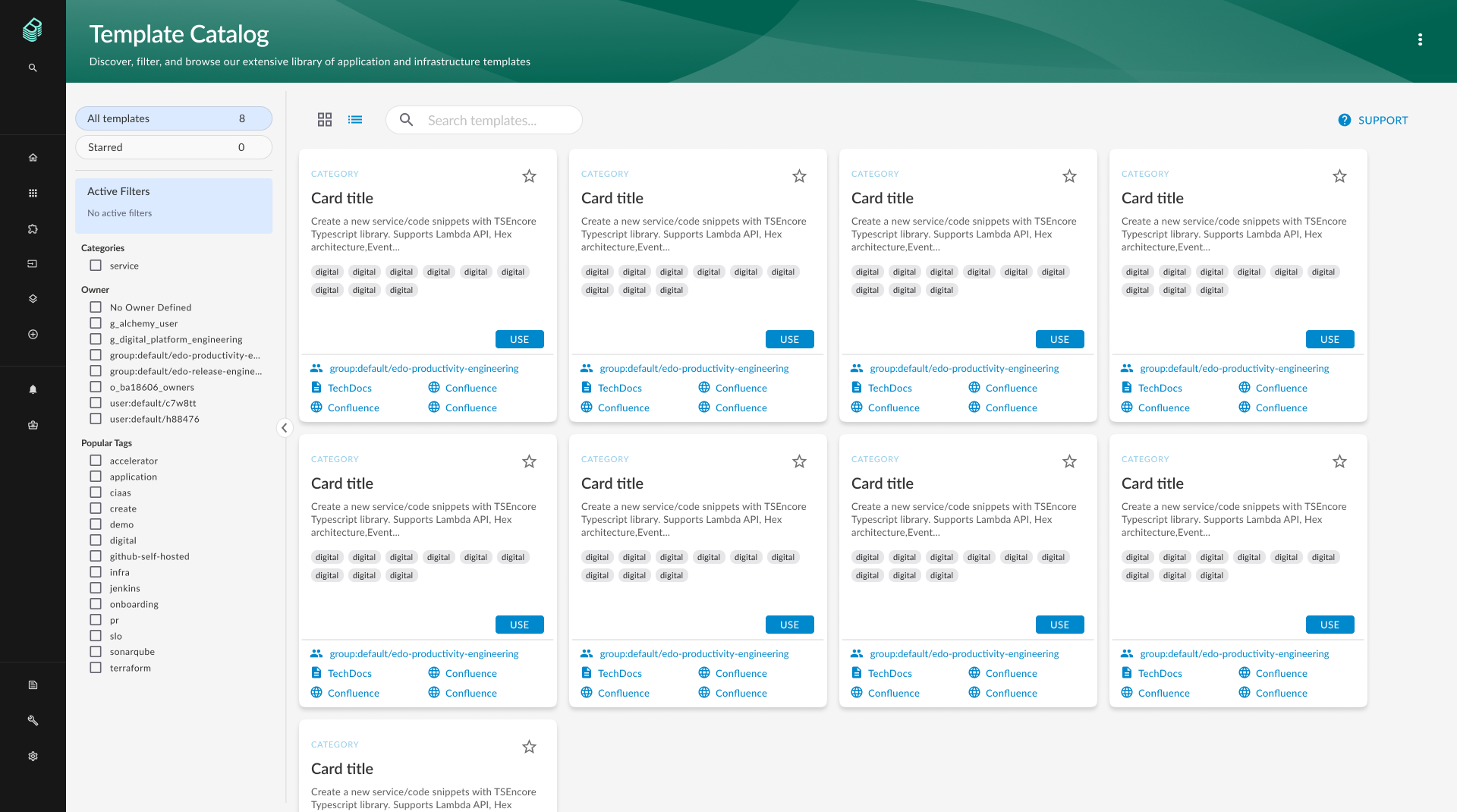 As the template ecosystem grew, developers struggled to find relevant templates quickly. The default catalog layout showed too few options above the fold, encouraged scrolling over scanning, and treated key metadata (tags) as static labels. The result: slower discovery, reduced confidence, and more support requests for "which template should I use?"