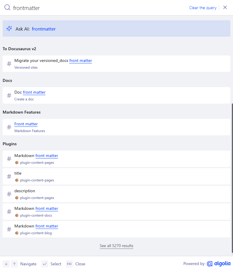 Even when Algolia works, it over-indexes: it crawls full document text, so search results surface pages that merely mention a term rather than pages that are about it.