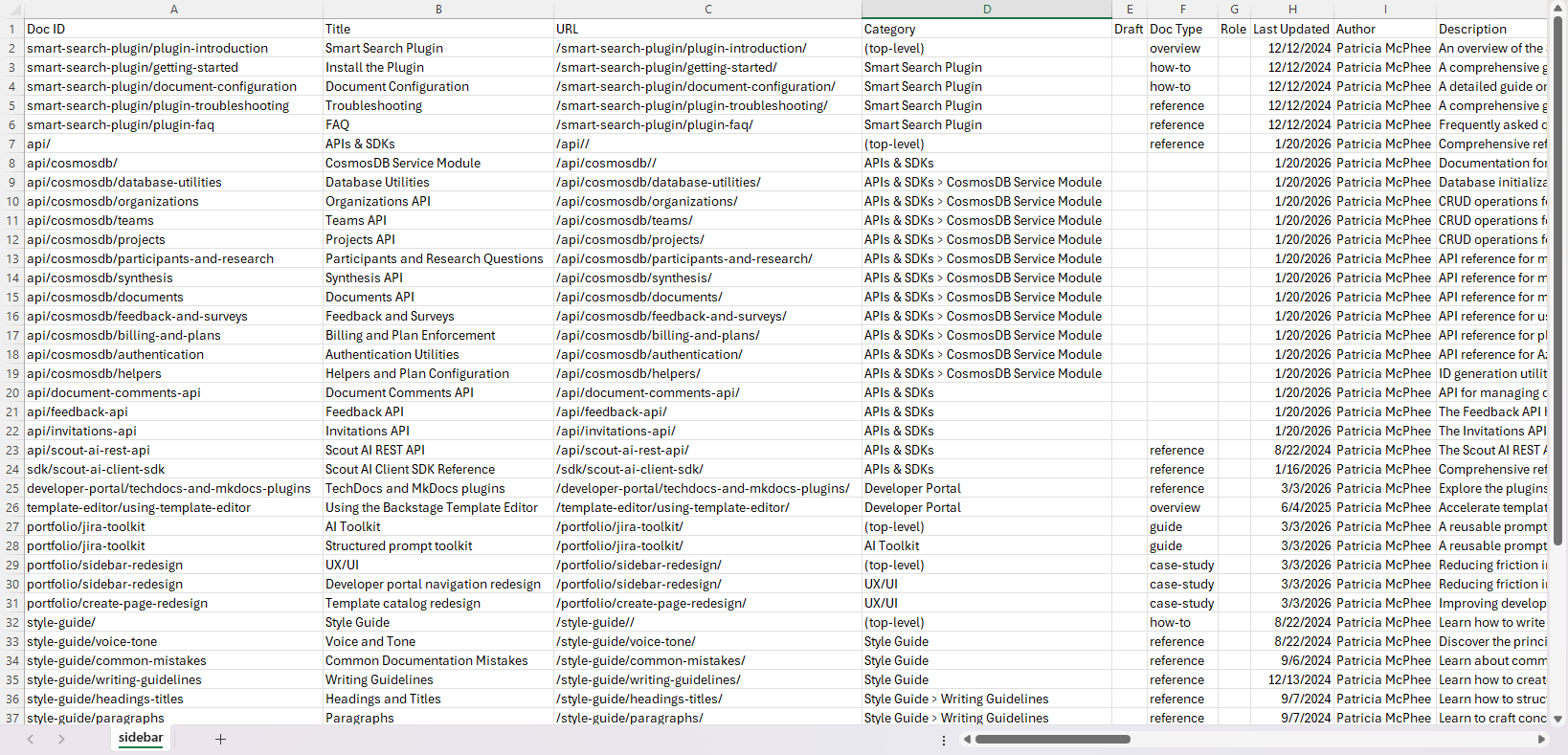 Content auditing in a single command. Run npm run export:sidebar to get a full CSV of your doc inventory — title, URL, doc type, owner, draft status, last updated.