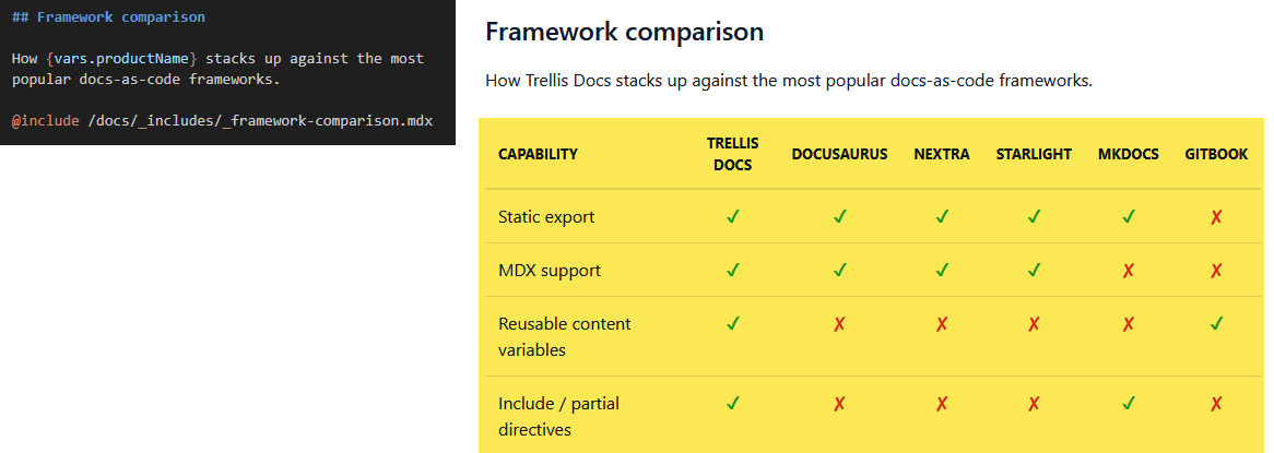 Where Docusaurus optimizes for flexibility and ecosystem breadth, Trellis Docs optimizes for the writer's daily experience. More opinions baked in, less configuration required.
