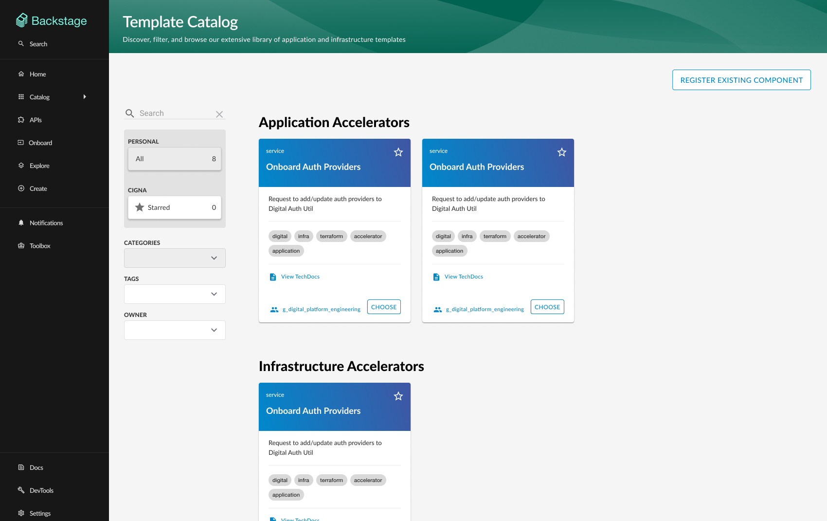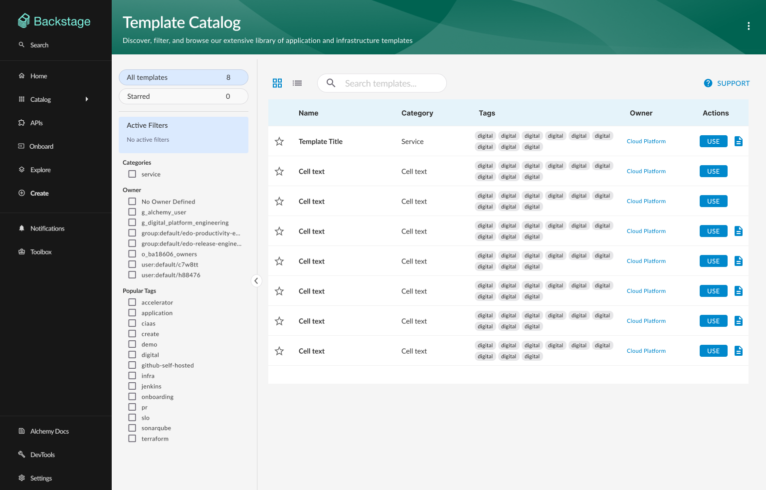 As the template ecosystem grew, developers struggled to find relevant templates quickly. The default catalog layout showed too few options above the fold, encouraged scrolling over scanning, and treated key metadata (tags) as static labels. The result: slower discovery, reduced confidence, and more support requests for "which template should I use?"